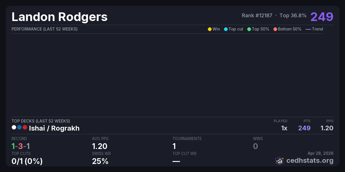 | Shuffle N Roll's cEDH Dual Land Tournament Apr 25, 2026 | Ishai / Rograkh | 20/52 | 1-3-1 | 249 |