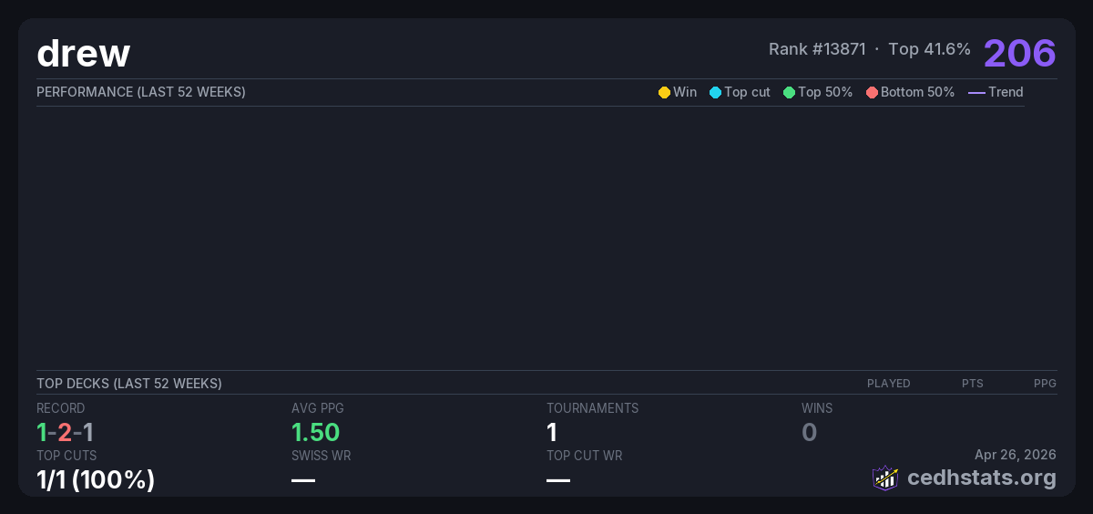 | monday cedh Aug 04, 2025 · 16 players | — | 3/16 | 1-2-1 | 1.50 | 206 |