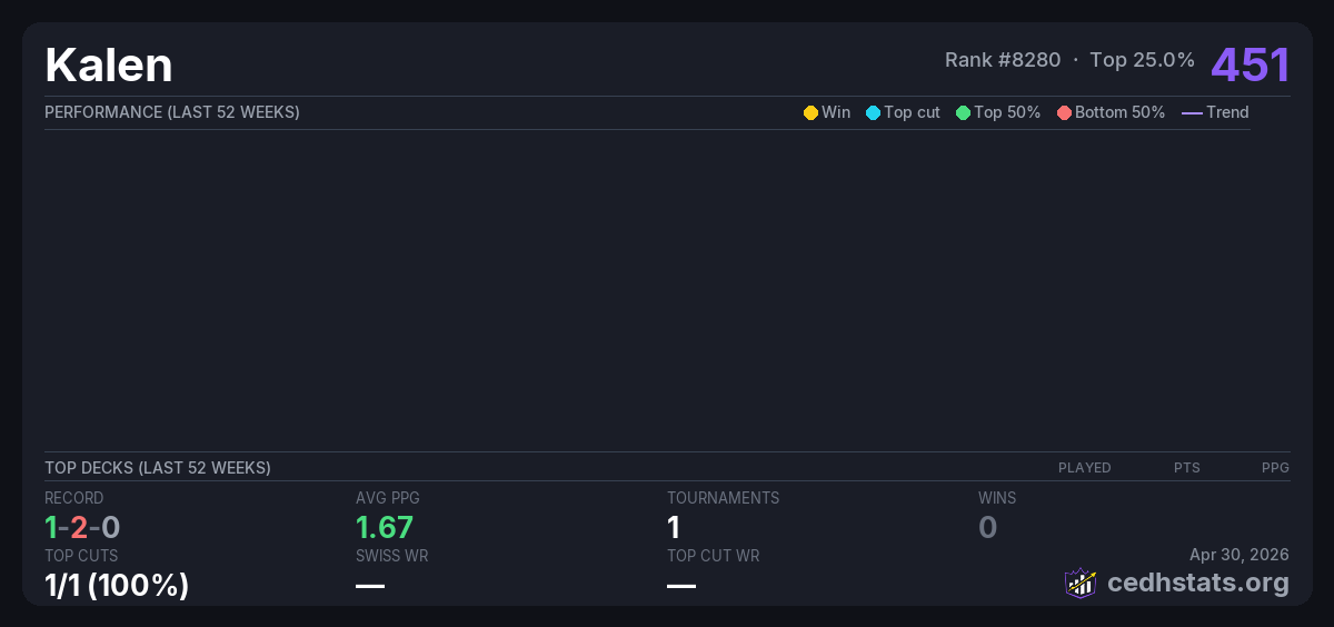 | Casual Commander :) Mar 21, 2026 · 17 players | 3/17 | 1-2-0 | 1.67 | 451 |