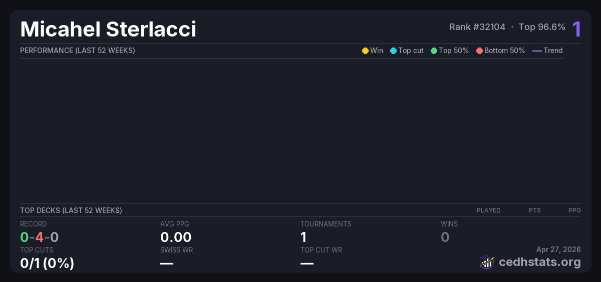 | Mt Moon cEDH - Mox Diamond Nov 22, 2025 · 16 players | Invalid pairing | 16/16 | 0-4-0 | 0.00 | 1 |