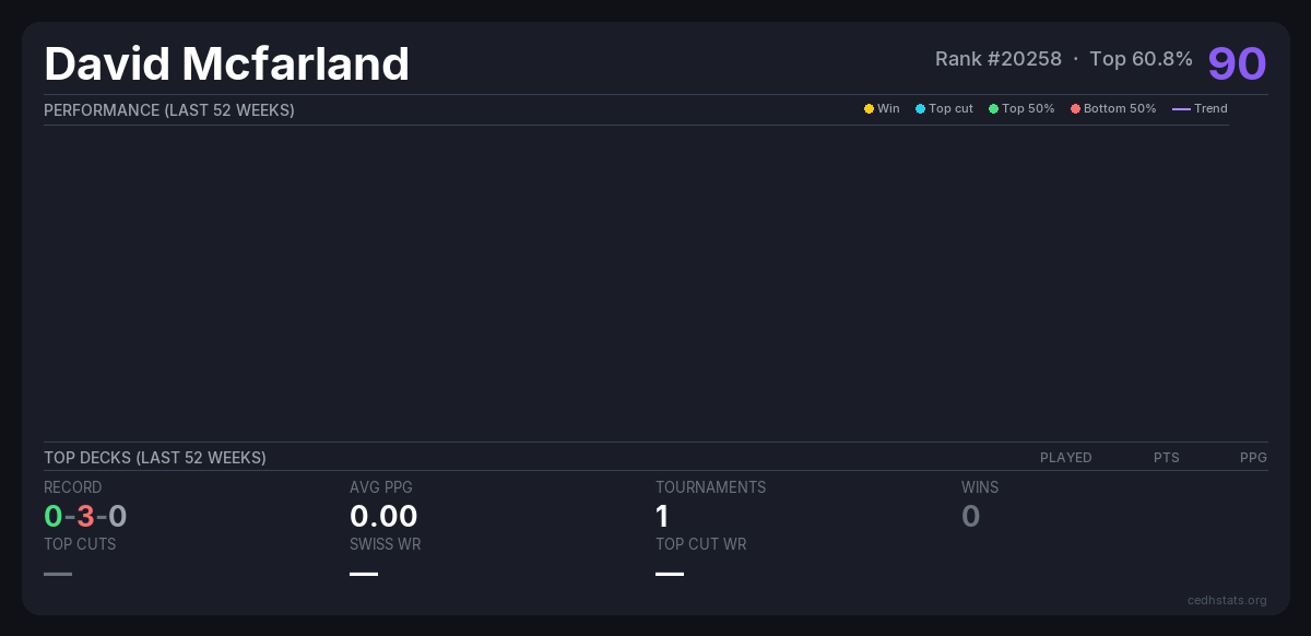 | Bracket 3 Mar 29, 2026 · 22 players | 12/22 | 0-3-0 | 0.00 | 90 |