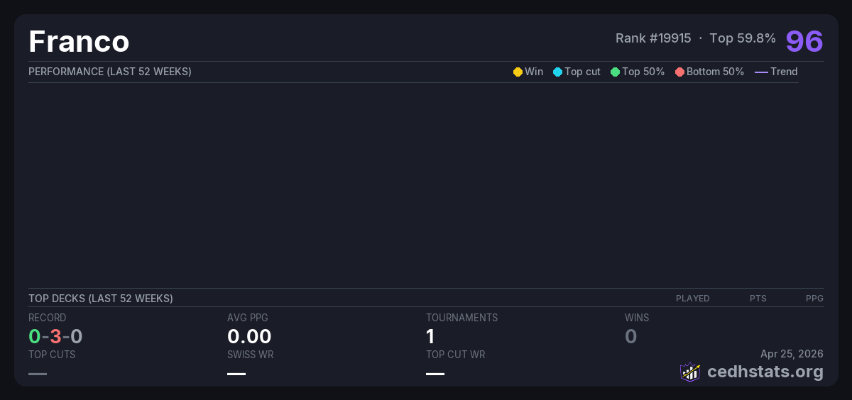 | Tournament | Deck | Result | Record | PPG | Points ? |