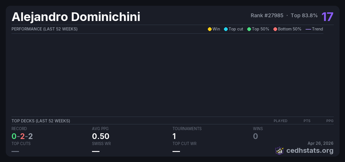 | EDH Quilmes Aug 23, 2025 · 19 players | Invalid pairing | 15/19 | 0-2-2 | 0.50 | 17 |