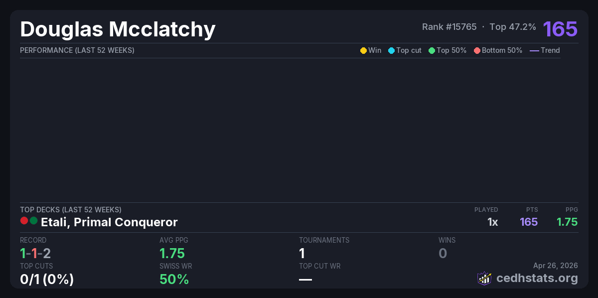 | TapStart Games “Tundra Down Unda” Apr 25, 2026 · 25 players | Etali, Primal Conqueror // Etali, Primal Sickness | 11/25 | 1-1-2 | 1.75 | 165 |