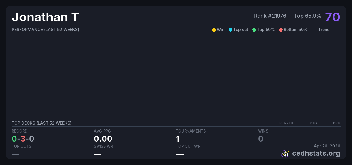 | Casual Saturday Commander - Obsidian Games Jan 11, 2026 · 22 players | 12/22 | 0-3-0 | 0.00 | 70 |