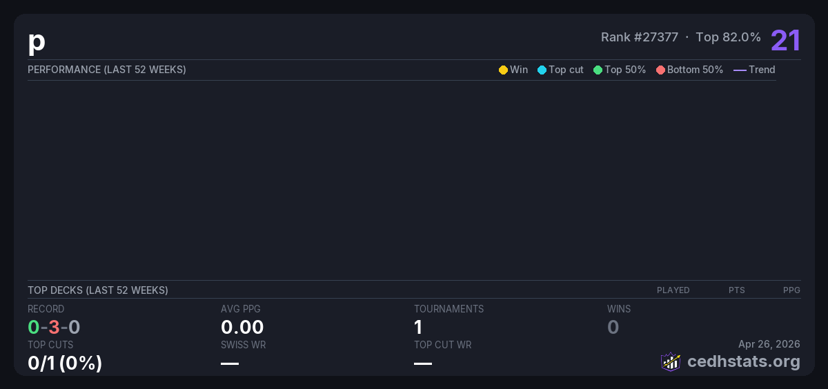 | testtt Nov 06, 2025 · 16 players | Invalid pairing | 12/16 | 0-3-0 | 0.00 | 21 |