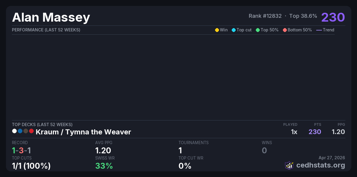 | Turf Wars: 1 - cEDH Apr 25, 2026 | Kraum / Tymna | 10/27 | 1-3-1 | 230 |