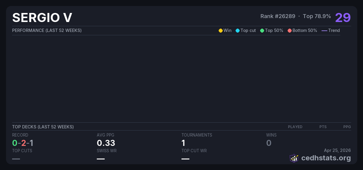 | CUDH Sep 25, 2025 · 24 players | Invalid pairing | 17/24 | 0-2-1 | 0.33 | 29 |