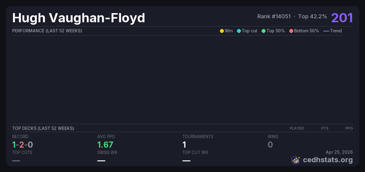 | Commander Weekly Wednesday 9/7/25 Jul 02, 2025 · 30 players | — | 9/30 | 1-2-0 | 1.67 | 201 |