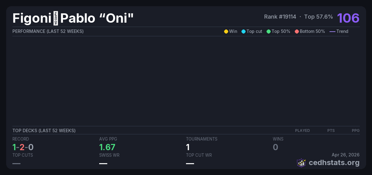 | Cdeh Dec 19, 2025 · 16 players | 6/16 | 1-2-0 | 1.67 | 106 |