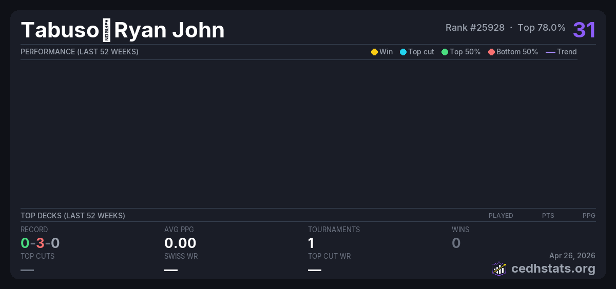 | Bracket 3 Commander Sep 28, 2025 · 16 players | — | 11/16 | 0-3-0 | 0.00 | 31 |