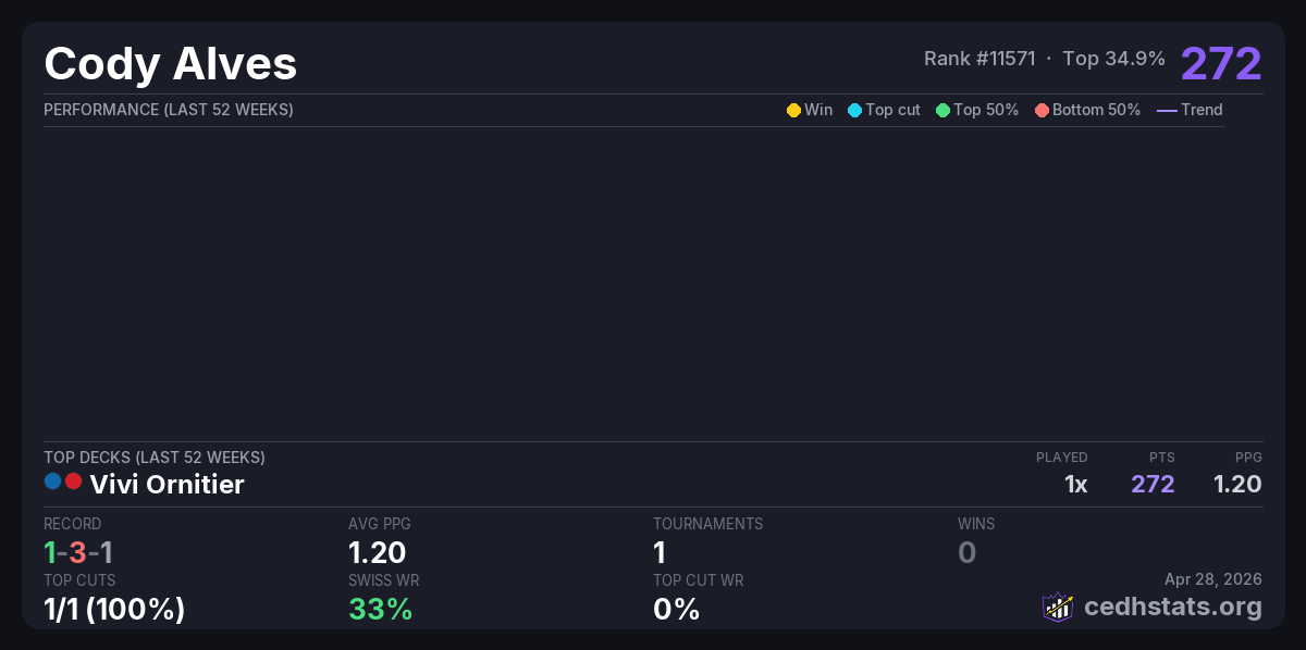 | The Land, Go Qualifier 2 - UT Apr 25, 2026 | Vivi Ornitier | 7/20 | 1-3-1 | 272 |