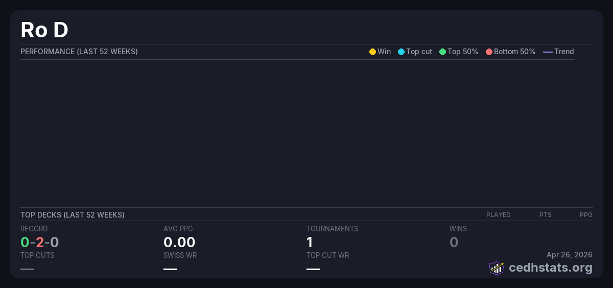 | Commander Precon Tournament: Tarkir: Dragonstorm May 02, 2025 · 19 players | Invalid pairing | 15/19 | 0-2-0 | 0.00 | — |
