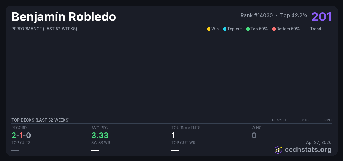 | Liga Commander M4E La Serena Julio Fecha 4 Jul 25, 2025 | Invalid pairing | 2/16 | 2-1-0 | 201 |