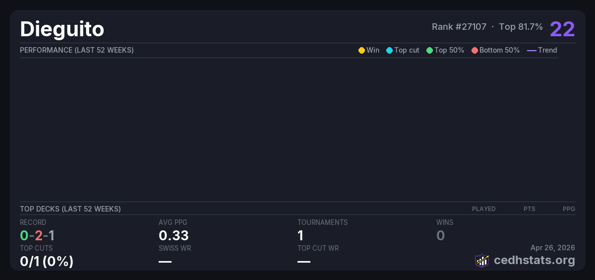 | 2nd 8Pocho Cup Jul 05, 2025 · 16 players | Invalid pairing | 12/16 | 0-2-1 | 0.33 | 22 |