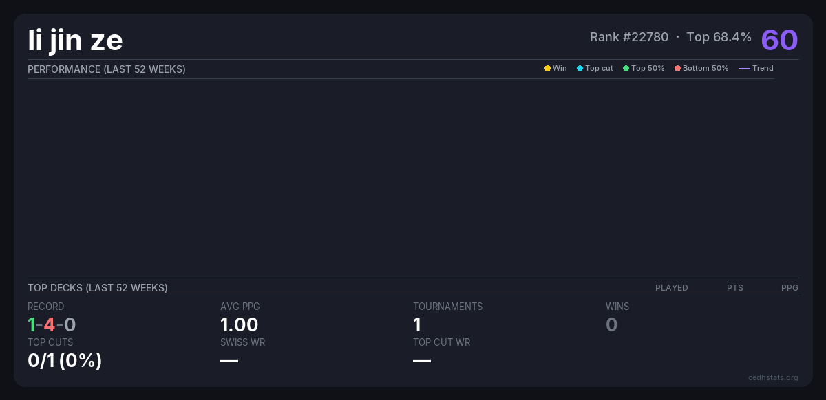 | CommandFest Beijing 2025 Aug 16, 2025 · 60 players | Invalid pairing | 36/60 | 1-4-0 | 1.00 | 60 |