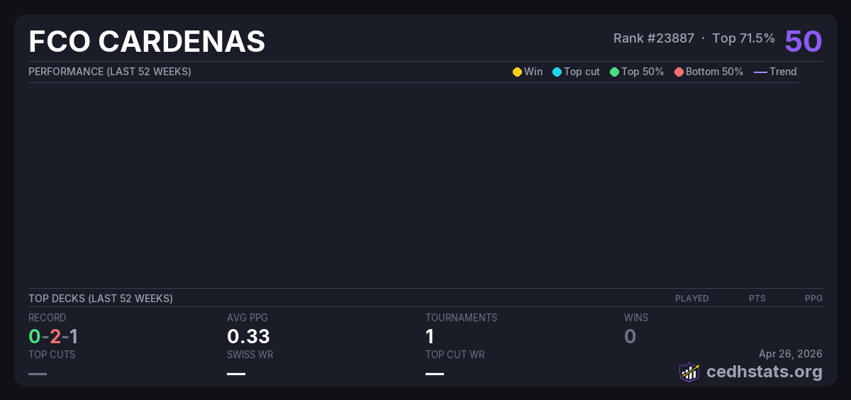 | CEDHI May 08, 2025 · 20 players | Invalid pairing | 12/20 | 0-2-1 | 0.33 | 50 |