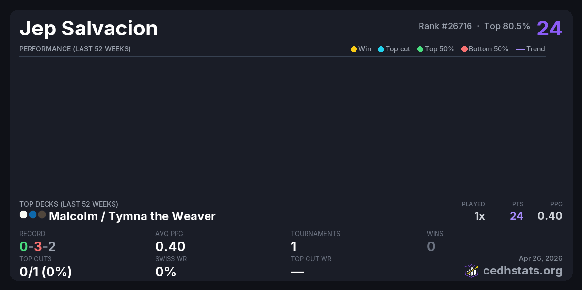 | Ascendancy: A CEDH Tournament Apr 26, 2026 · 40 players | Malcolm / Tymna | 32/40 | 0-3-2 | 0.40 | 24 |