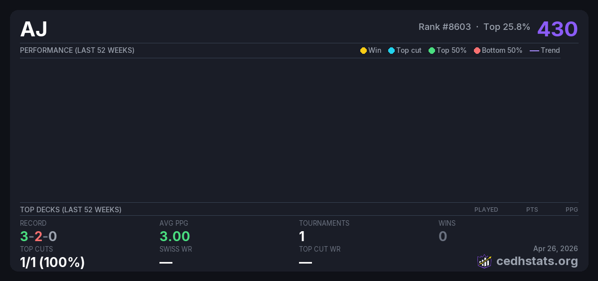| Mono-color B3 Feb 22, 2026 · 17 players | 2/17 | 3-2-0 | 3.00 | 430 |