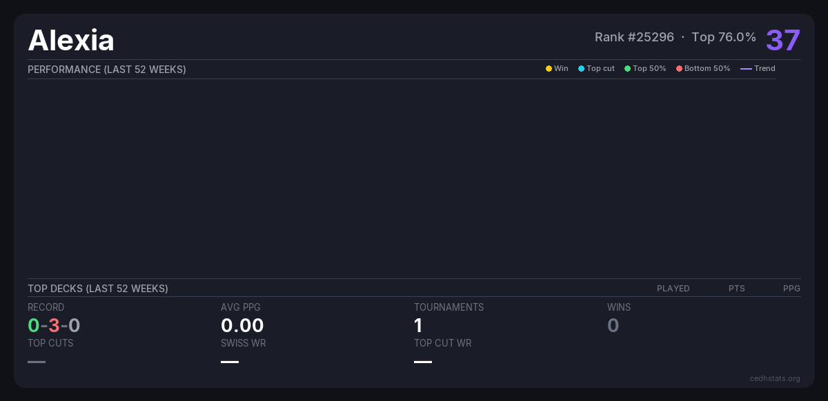 | Bracket 3 Mar 29, 2026 · 22 players | 16/22 | 0-3-0 | 0.00 | 37 |