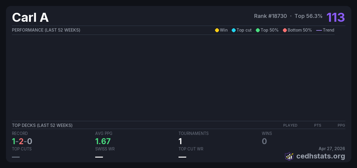 | Casual Commander 05/10/2025 Oct 05, 2025 | Invalid pairing | 7/16 | 1-2-0 | 113 |