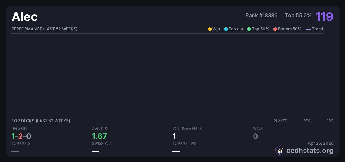 | Unaltered Precon Oct 12, 2025 · 26 players | Invalid pairing | 10/26 | 1-2-0 | 1.67 | 119 |