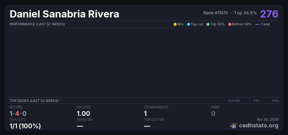 | Tournament | Deck | Result | Record | PPG | Points ? |