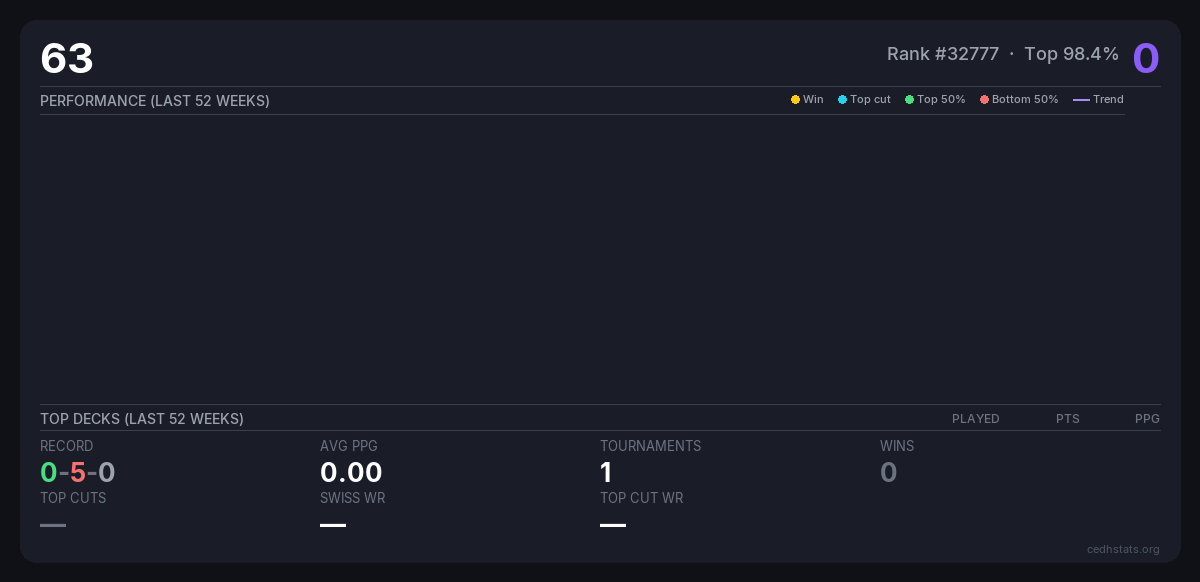 | PRUEBA Jul 09, 2025 · 64 players | Invalid pairing | 63/64 | 0-5-0 | 0.00 | 0 |