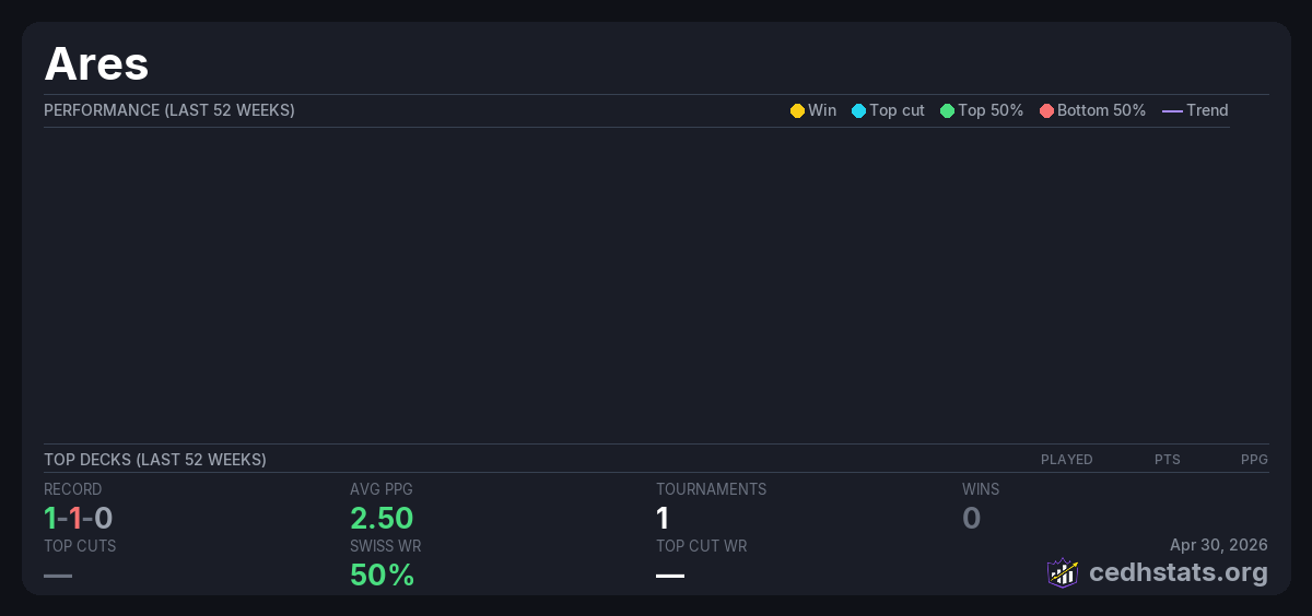 | MTG: Commander Budget (Bracket 2) Apr 30, 2026 · 18 players | — | 8/18 | 1-1-0 | 2.50 | — |