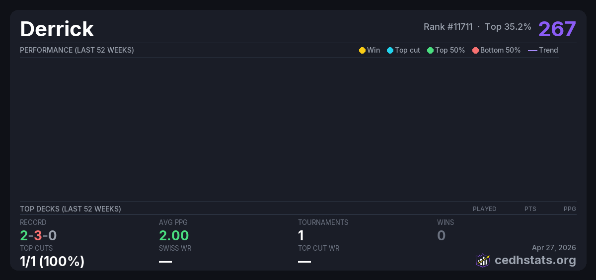 | Tournament | Deck | Result | Record | PPG | Points ? |