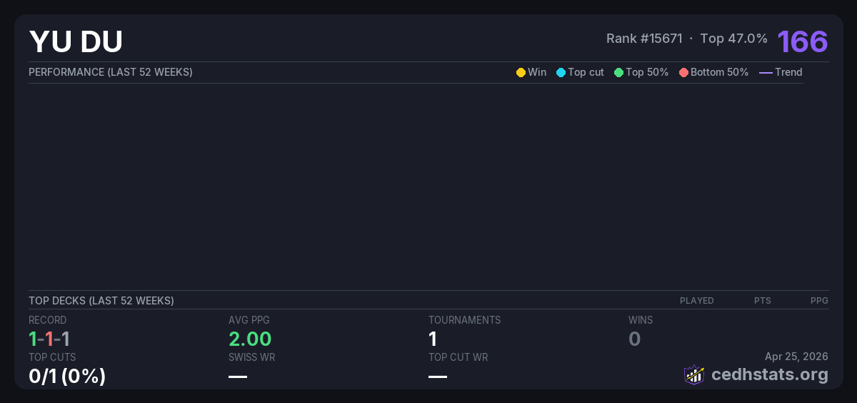 | 2月8日 CEDH月赛 Feb 08, 2026 | 7/26 | 1-1-1 | 166 | |