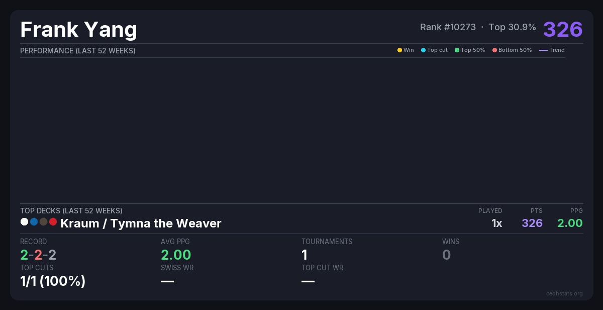 | Command Fest Shanghai 250524 May 24, 2025 · 93 players | Kraum / Tymna | 13/93 | 2-2-2 | 2.00 | 326 |