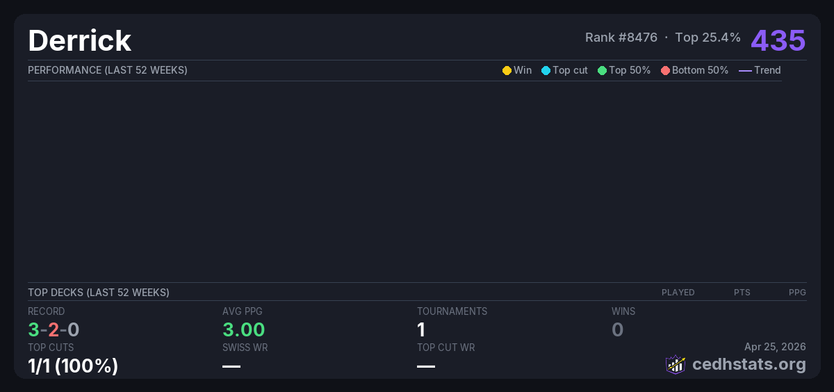 | Unaltered Precon Nov 16, 2025 · 24 players | Invalid pairing | 2/24 | 3-2-0 | 3.00 | 435 |