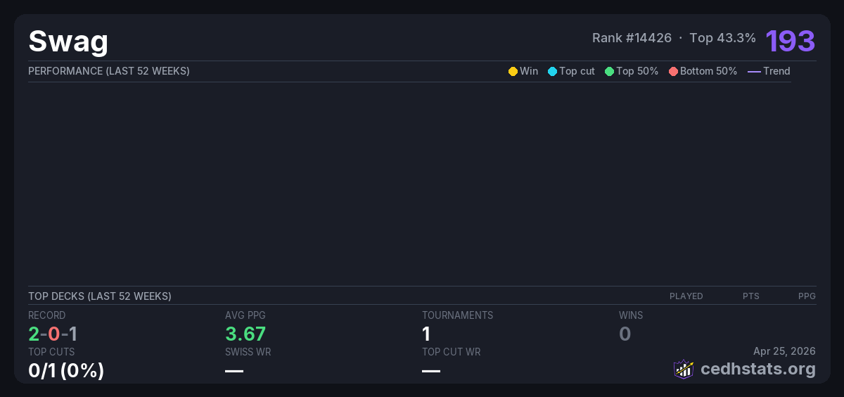 | Magic Monday Jan 27, 2026 · 28 players | 6/28 | 2-0-1 | 3.67 | 193 |