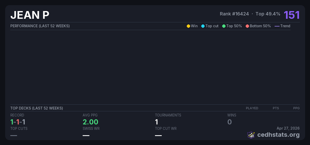 | CEDHH Jan 08, 2026 · 16 players | 4/16 | 1-1-1 | 2.00 | 151 |