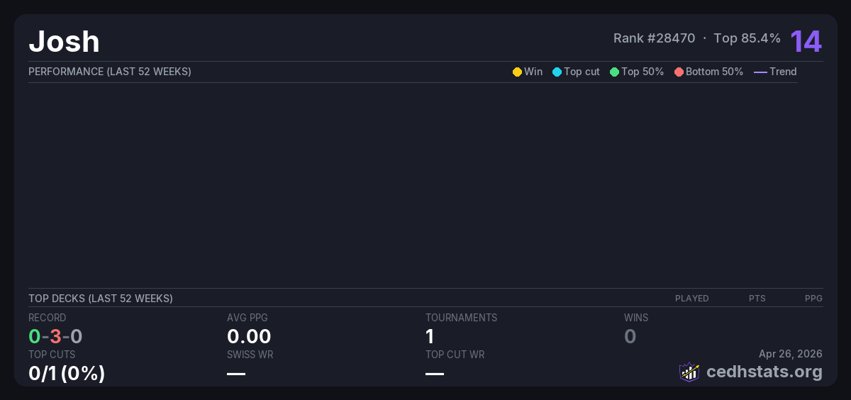 | Tournament | Deck | Result | Record | PPG | Points ? |
