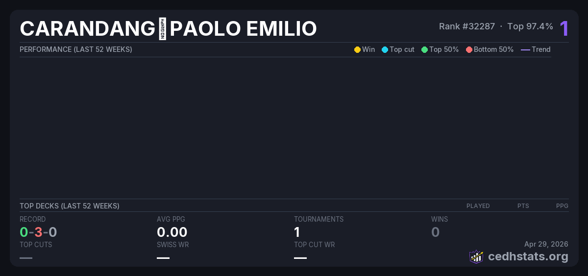 | Bracket Commander Sep 07, 2025 · 19 players | — | 19/19 | 0-3-0 | 0.00 | 1 |