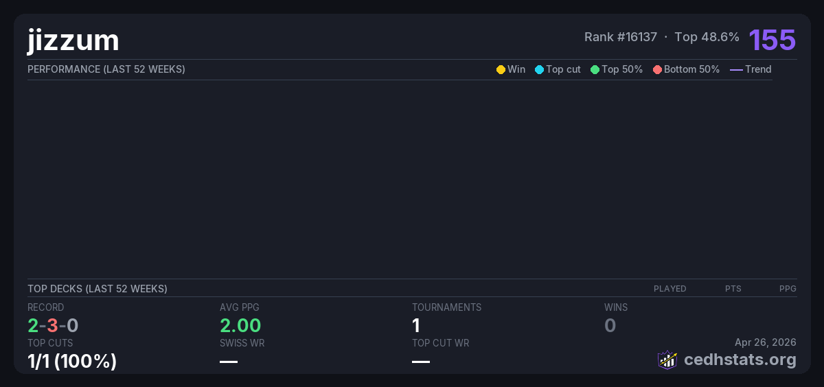 | test tourney Oct 12, 2025 · 16 players | Invalid pairing | 4/16 | 2-3-0 | 2.00 | 155 |