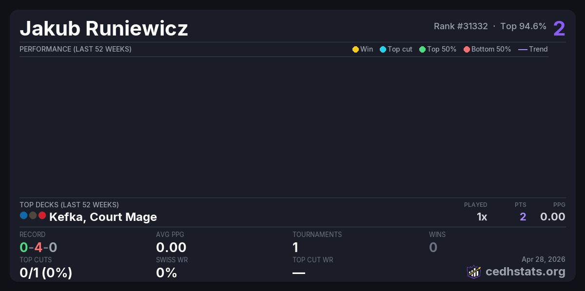 | cEDH Poznan #7: Breach & Breakfast vol. 1 Apr 25, 2026 · 28 players | Kefka, Court Mage // Kefka, Ruler of Ruin | 27/28 | 0-4-0 | 0.00 | 2 |