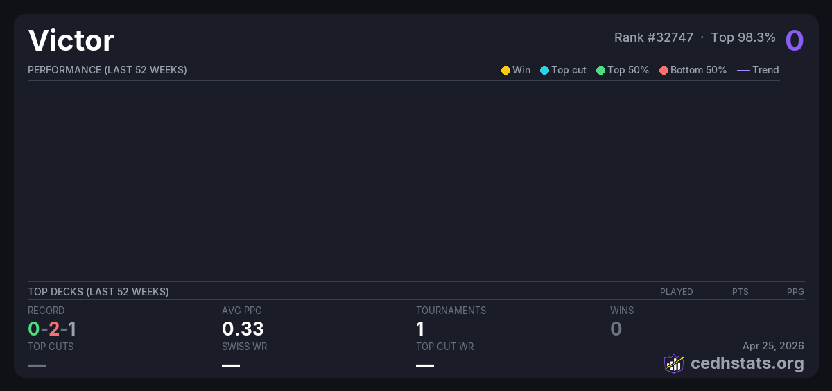 | Commander Party Lorwyn Jan 30, 2026 · 26 players | 26/26 | 0-2-1 | 0.33 | 0 |