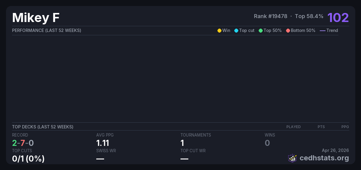 | The Iron Lion July CEDH League Jul 02, 2025 | — | 8/19 | 2-7-0 | 102 |