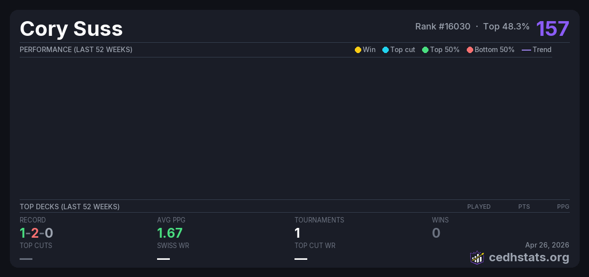 | Bracket 3 Mar 08, 2026 · 26 players | 9/26 | 1-2-0 | 1.67 | 157 |