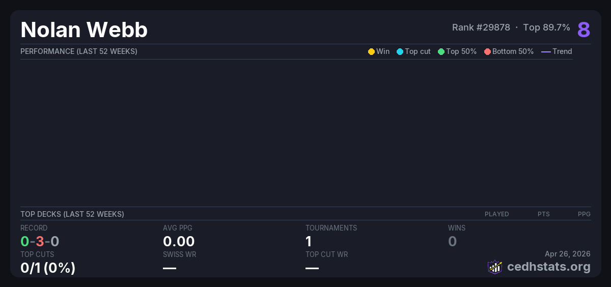 | Store Championship Nov 02, 2025 | Invalid pairing | 14/16 | 0-3-0 | 8 |
