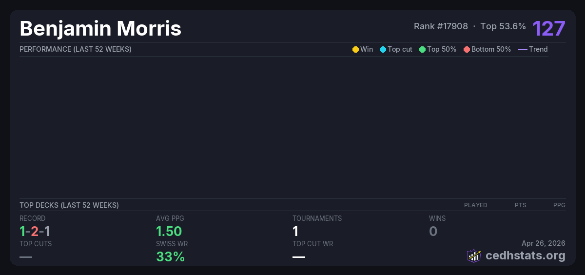 | A-State Magic: The Gathering Club Tournament Apr 25, 2026 · 16 players | — | 4/16 | 1-2-1 | 1.50 | 127 |