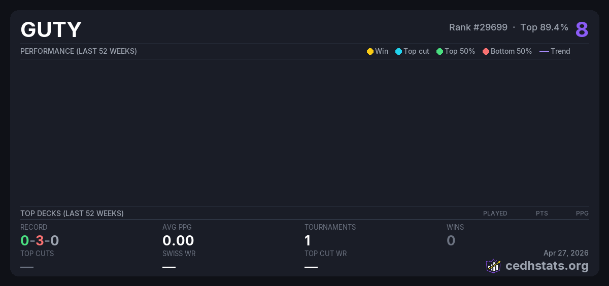 | paRa Sep 09, 2025 · 16 players | Invalid pairing | 14/16 | 0-3-0 | 0.00 | 8 |
