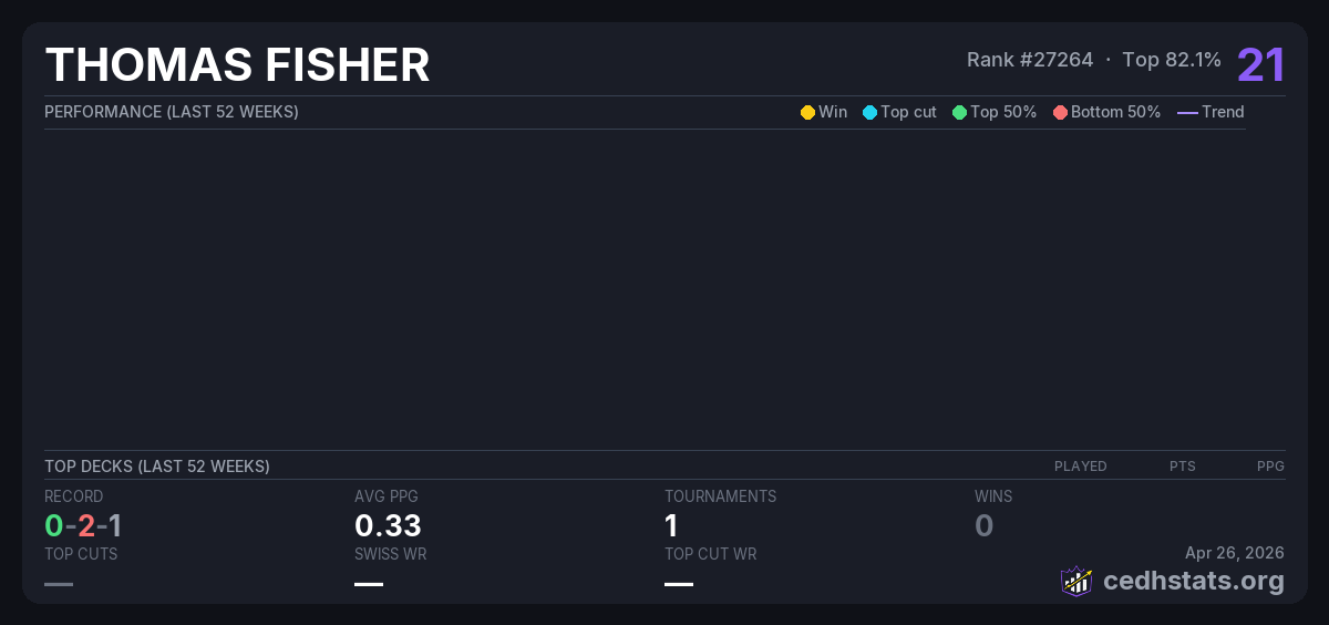 | cidh Jun 05, 2025 · 16 players | Invalid pairing | 12/16 | 0-2-1 | 0.33 | 21 |