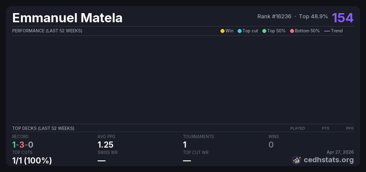 | Year End CEDH Dec 28, 2025 · 18 players | 7/18 | 1-3-0 | 1.25 | 154 |