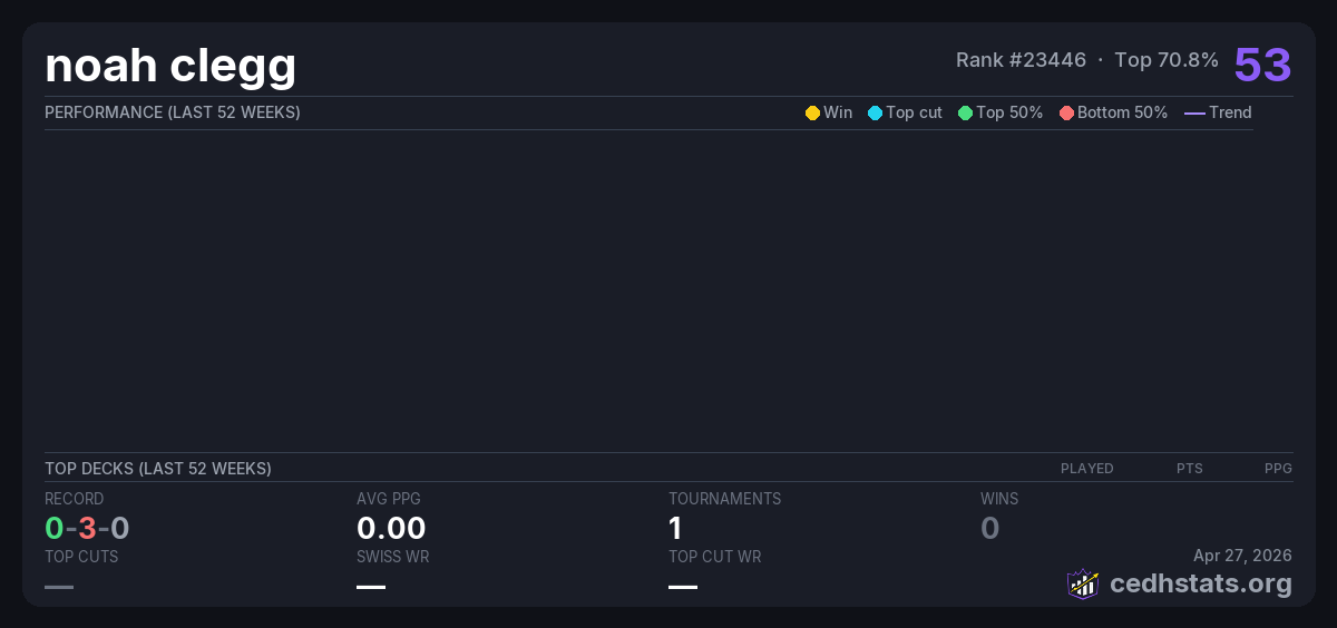 | FNM Commander @ Game On! NC Jun 20, 2025 · 32 players | Invalid pairing | 21/32 | 0-3-0 | 0.00 | 53 |
