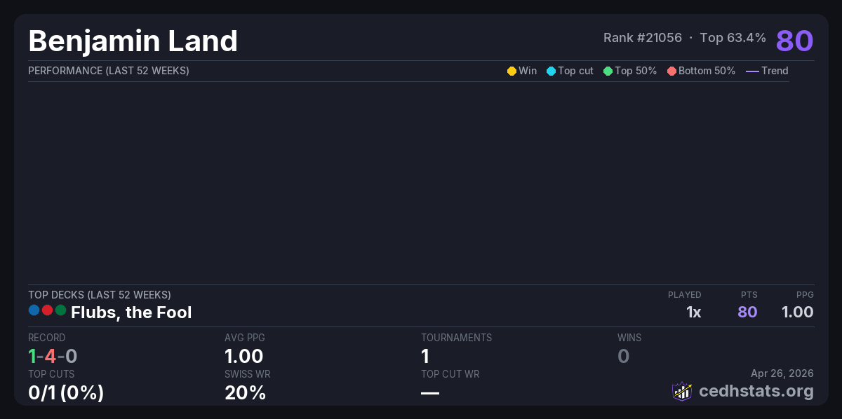 | 100% Dual Land CEDH Tournament Apr 25, 2026 · 32 players | Flubs, the Fool | 20/32 | 1-4-0 | 1.00 | 80 |