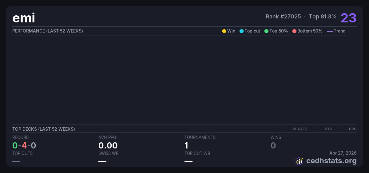 | THEONETOURNAMENTO Jan 19, 2026 · 16 players | 12/16 | 0-4-0 | 0.00 | 23 |